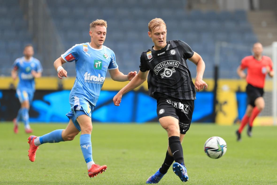 Die Ausgangslage war klar. Auf der einen Seite der Zweitplatzierte, der zuletzt sechs Spiele lang ungeschlagen blieb. Der Hausherr. Der Favorit. Auf der anderen Seite der Tabellenletzte, der auch nach sieben Spieltagen noch auf seinen ersten Sieg wartet – und im Vorjahr in vier Spielen gerade mal einen Punkt gegen den ungeliebten Gegner ergatterte. Der Underdog, der das Spiel aber so anlegte, als es ob es die negativen Vorzeichen gegen ihn nicht gäbe. Mutig. Engagiert. Druckvoll. Aber mit Pech. Denn nach den Ausfällen von Giacomo Vrioni und Maxime Awoudja vor dem Spiel kam nach acht Minuten jener von Tobias Anselm dazu. Der 21-Jährige, zuletzt in bestechender Form, musste mit Verdacht auf einen Kreuzbandriss schmerzverzerrt vom Feld getragen werden. Für ihn kam Thomas Sabitzer. Ein Ausfall, der die Elf von Thomas Silberberger vorerst aber eher zu motivieren schien, als zu hemmen. Frei nach dem Motto: jetzt erst recht! Denn in der Anfangsphase spielten eigentlich nur die Tiroler, kamen zu Möglichkeiten – und vernebelten sie. Zuerst Markus Wallner (12.), dessen Schussversuch von Jörg Siebenhandl zur Ecke geklärt werden konnte. Der folgende Corner brachte die zweite Chance für den 24-Jährigen (13.) – diesmal ging der Schuss, wenn man den Versuch so nennen will, weit über das Tor. Nach einem Abschluss von Žan Rogelj (16.), zu zentral platziert, um für Gefahr zu sorgen, hatte abermals Wallner (22.) die bis dahin größte Chance im Spiel, völlig alleine vor dem weit vor dem Tor stehenden Schlussmann der Grazer. Anstatt Siebenhandl zu überheben, servierte Wallner dem Goalie die Kugel am goldenen Tablett. Rückpass statt erstes Bundesligator.