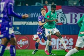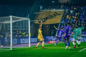 Der Matchplan des Steirers erwies sich in der Anfangsphase als goldrichtig. Unsere Grün-Weißen starteten mutig und mit viel Ballkontrolle in das sechste Auswärtsspiel der laufenden Spielzeit. Dennoch galt es nach neun Spielminuten den ersten Rückschlag zu verkraften. Innenverteidiger David Gugganig prallte nach einem Eckball mit Austria-Keeper Sahin-Radlinger zusammen und musste nach intensiver medizinischer Behandlung mit Verdacht auf Schlüsselbeinbruch per Trage vom Feld gebracht werden. Ihn ersetzte Alexander Ranacher, der in der Folge die rechte Schiene besetzte, während Cem Üstündag in die Innenverteidigung rückte. Trotz der Schrecksekunde behielt unsere Elf einen kühlen Kopf und knöpfte in der Folge nahtlos an die starke Anfangsphase an. Nach 25 Minuten konnte mit eindrucksvollen 65 Prozent Ballbesitz das Geschehen gänzlich kontrolliert und die Gastgeber weit vom eigenen Tor ferngehalten werden. Nach einer knappen halben Stunde wussten unsere Burschen schließlich ihre Dominanz in Torabschlüsse umzumünzen. Zunächst parierte Sahin-Radlinger einen strammen Taferner-Schuss (30’), ehe Butler aus spitzem Winkel knapp scheiterte (34’). Erst gegen Ende des ersten Abschnitts griff auch die Offensivreihe der Veilchen ins Geschehen ein. Zunächst versuchte sich Malone mit einem Kopfball (38’), dann war Adam Stejskal gegen Gruber zur Stelle (40’). Weil unser Rückhalt auch bei zwei weiteren Malone-Abschlüssen die Oberhand behielt, ging es zur Pause mit einem torlosen Remis in die Kabinen.