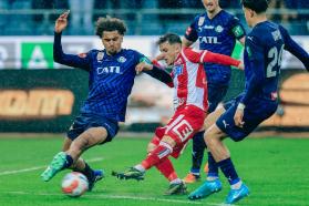 Vor 4.203 Zuschauer:innen und einer beeindruckenden Choreographie der Rotjacken-Anhänger:innen taten sich beide Mannschaften zu Beginn der 23. Runde schwer, kontinuierliche Ballstafetten aufzubauen. Der Platz in der Merkur Arena zeigte sich am Rande der Bespielbarkeit und unter strömenden Regen waren es die Hausherren, die die erste Chance der Partie vorfanden. Maderner wurde mit einem langen Ball in Szene gesetzt und prüfte die Aufmerksamkeit von Rückhalt Adam Stejskal. Der Tscheche hatte bei dem Abschluss des großgewachsenen Mittelstürmers aber keine Probleme (4‘). Das Duell plätscherte im Anschluss im wahrsten Sinne des Wortes vor sich hin, allerdings mit zunehmenden Vorteilen für unsere Grün-Weißen. Lukas Hinterseer aus schwieriger Lage per Kopfball (25‘) und Quincy Butler mit einer Direktabnahme aus spitzem Winkel (33‘) verzeichneten zarte Torannäherungen in Richtung des Kastens des Aufsteigers. Kurz vor Pausenpfiff war es abermals der pfeilschnelle US-Amerikaner, der den Atem der Steirer zum Stocken brachte. Nach einem mustergültigen Haken im Strafraum der Heimischen zog der Wingback platziert in die untere Ecke ab, ehe Wiegele mit einem blitzsauberen Reflex unsere Führung verhindern konnte (44‘). Damit blieb es beim torlosen ersten Spielabschnitt.