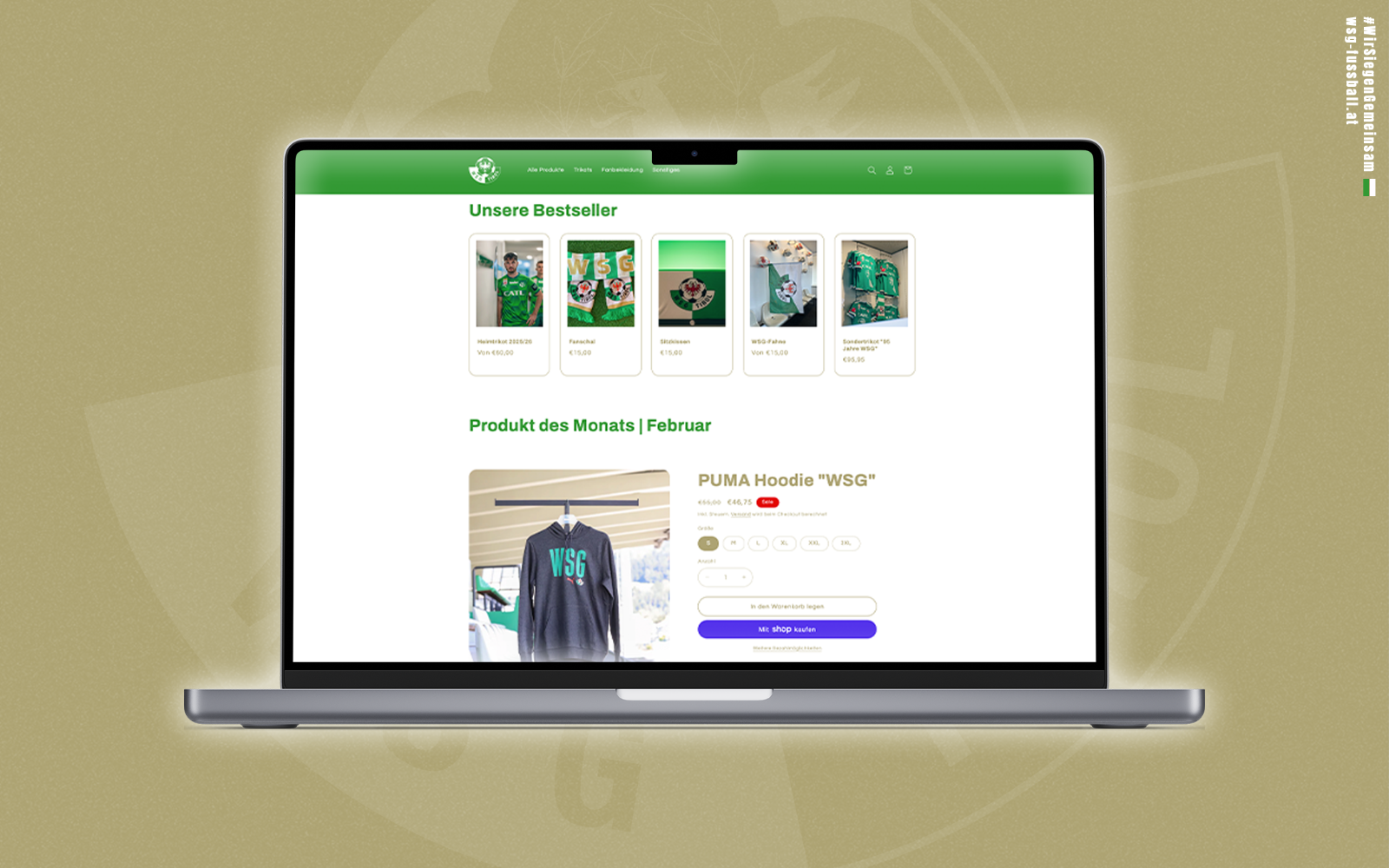 Einfache und kundenfreundliche Bedienung, neue Zahlungsmöglichkeiten und mit den WSG-Fahnen ein brandneues Produkt. Pünktlich zum Auftakt in das neue Pflichtspieljahr geht der Tiroler Bundesligist mit einem brandneuen Onlineshop ins Rennen. Neben der übersichtlichen Personalisierung von Trikots aller Art besticht der Onlineshop auch mit Zahlungsmöglichkeiten wie PayPal und Apple Pay. Viel Spaß beim Stöbern!