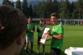 24 Spiele, 19 Siege, drei Unentschieden und nur zwei Niederlagen - unsere U18 ließ es in dieser Saison ordentlich krachen, erzielte 106 Treffer und ließ nur 13 zu. Dennoch war es bis zum Schluss ein Kopf an Kopf rennen mit dem starken SC Schwaz, der am letzten Spieltag mit einem Sieg gegen die SVG Reichenau den Titel fixieren hätte können, sich aber mit 4:3 geschlagen geben musste. Einen Tag später machte die Mannschaft von Rainer Berger und Michi Hörtnagl Nägel mit Köpfen und holte sich mit einem deutlichen 8:0-Erfolg gegen den SVI den Tiroler Meistertitel. Lange Zeit lagen die 18er hinter den Schwazern, mit sechs Siegen in Serie holten sich die Burschen dennoch den Titel. Im Testspiel der Einser gegen Olympiakos Piräus holten sich die Burschen die verdienten Meisterehrungen ab. Ab der kommenden Saison wird unsere U18 in der 2.Klasse als dritte Kampfmannschaft einsteigen. Auf diesem Wege noch einmal: Herzliche Gratulation, Männer!