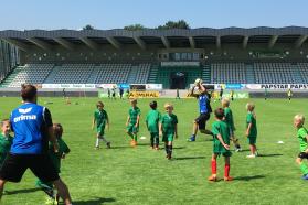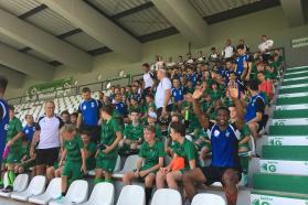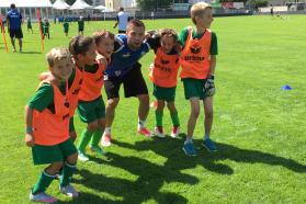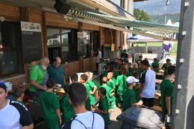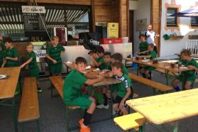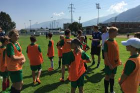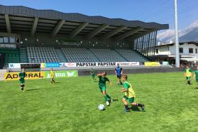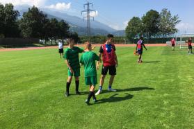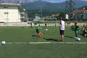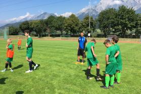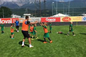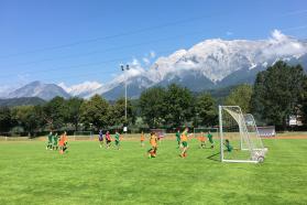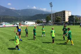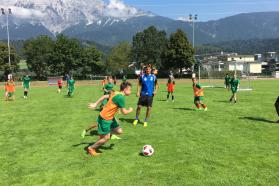 Gleich zu Beginn von Tag Zwei stand eines fest, heute wird es richtig heiß und damit sollte auch das Wattener Schwimmbad endlich zum Zuge kommen. Bereits am Vormittag knallte die Sonne vom Tiroler Himmel auf die Trainingsplätze des Gernot Langes Stadion. Und es sollte ein besonderer Trainingstag werden, denn die Profis der WSG nahmen sich nach ihrem eigenen Training noch genügend Zeit, um mit dem Nachwuchs die gepflegte Ballbehandlung zu üben. In jeder Gruppe fanden sich mindestens zwei Kicker der Kampfmannschaft wieder und versorgten die Jugend mit Tipps und Tricks aus dem eigenen Repertoire. Es folgten enge Partien mit vielen wunderbaren Toren, ausgelassenen Jubeltrauben und jeder Menge Einsatz. Nach dem Schlusspfiff versammelten sich alle Campteilnehmer inklusive den Wattens-Profis zum gemeinsamen Gruppenfoto auf den Tribünen des Gernot Langes Stadion. Danach ging es ans hart verdiente Mittagessen, um die Batterien wieder aufzuladen. Der Nachmittag startete mit einer herrlich-erfrischenden Abkühlung im Freibad. Nachdem die Badesachen wieder gegen die Sportbekleidung getauscht wurden, standen die Gruppenfotos am Programm, welche möglichst schnell eingefangen werden mussten, denn der Drang die Bälle im Netz zu versenken, war den Mädels und Burschen deutlich anzumerken.